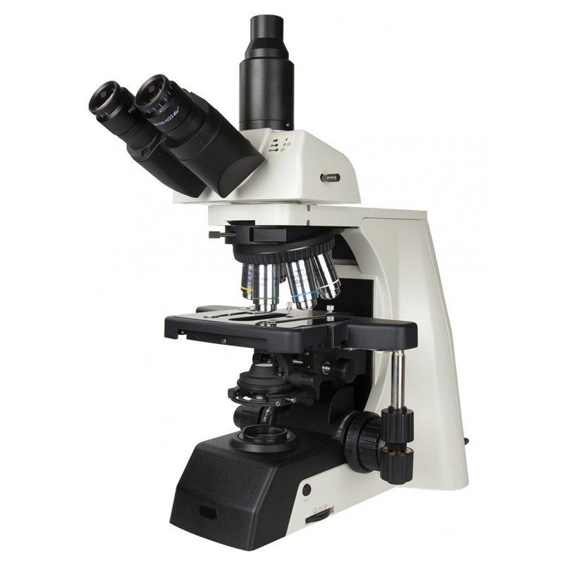 مزود برأس ثلاثي العدسات، مما يتيح توصيل أي كاميرا مجهرية عبر مسار مراقبة مستقل. يتميز الأنبوب الثلاثي بإمكانية ضبط الارتفاع، مما يسمح بمحاذاة دقيقة للتركيز بين مستشعر الكاميرا والعدسات العينية. يستخدم المجهر نظامًا بصريًا مصححًا لللانهاية مع عدسات ذات طول بصري 60 مم، مما يوفر مسافة عمل أطول. ينتج عن ذلك صورة أكثر وضوحًا وسطوعًا وألوانًا أكثر حيوية.