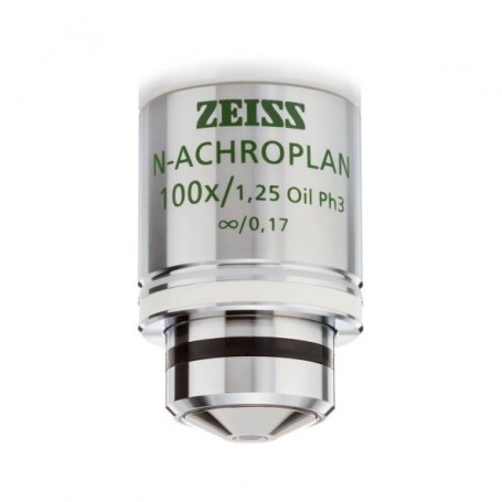 Обективът ZEISS N-Achroplan 100x/1.25 Oil Ph3 е проектиран за високорезолюционна фазово-контрастна микроскопия в лабораторна и академична среда. Дизайнът му за работа с имерсионно масло и високата числова апертура осигуряват отлична пропускливост на светлината и детайлна яснота на изображението при максимално увеличение. С планова оптична корекция гарантира плоско и рязко фокусирано изображение по цялото зрително поле. Безкрайно-коригираната оптична система осигурява съвместимост със съвременни микроскопски платформи, което го прави особено подходящ за университетско обучение и научни изследвания.