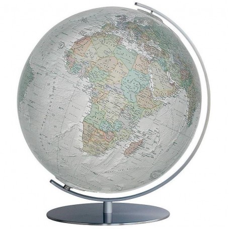 When illuminated, the globe transforms its appearance and character. The oceans shine in classic blue, while the continents proudly display their mountains and valleys through a three-dimensional relief shading effect.