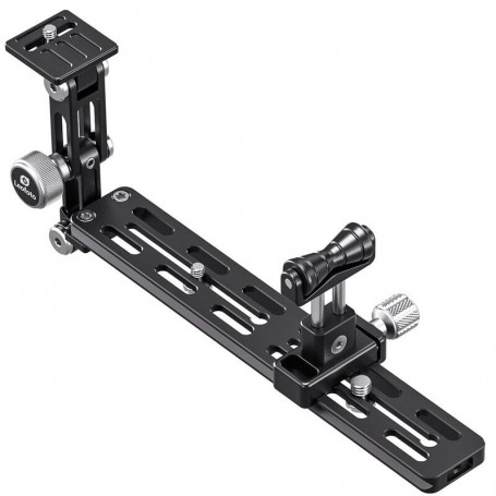 When shooting with a long and heavy lens that has its own tripod mount, it's extremely beneficial to support the lens while also reducing the load on the camera. The VR-250 KIT features an adjustable camera plate with a 1/4" screw at the rear of the lens support, which attaches to the camera's tripod thread. This setup relieves tension on the camera’s bayonet mount. The VR-250 KIT includes a 250 mm long rail. The camera support offers adjustable height (0–75 mm), and the lens support height can be set between 47 and 72 mm for optimal fit.
