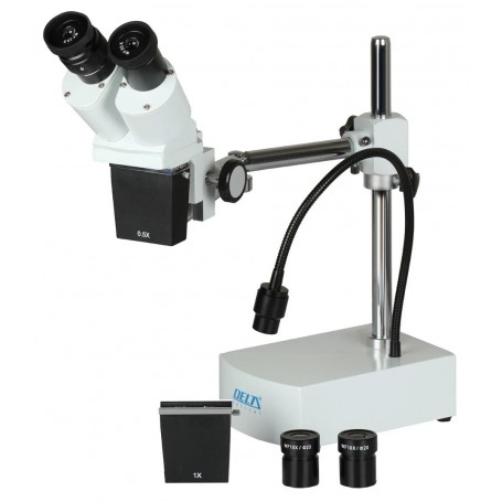 The microscope is supplied with 0.5x and 1x objectives as well as 10x and 20x eyepieces, allowing total magnifications of 5x, 10x, and 20x. The stand with an adjustable arm and flexible LED illumination mounted on a gooseneck allows relatively large, opaque objects to be placed under the microscope while maintaining proper lighting conditions.