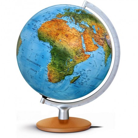 Le Globe Rathgloben DFNI 30 17 est un globe de table fabriqué à la main qui allie artisanat traditionnel et cartographie moderne. Chaque globe est méticuleusement assemblé à la main, en utilisant un processus où 12 segments imprimés sont soigneusement appliqués sur la sphère, garantissant un chevauchement minimal et une finition sans couture. Ce globe illuminé présente une cartographie à double image : lorsqu'il est éteint, il affiche une carte physique avec un indice de végétation, et lorsqu'il est illuminé, il révèle les frontières politiques. Le globe comprend un câble d'alimentation intégré pour une illumination facile et repose sur une base en bois de hêtre avec un méridien en métal de couleur argentée, ce qui en fait un ajout à la fois fonctionnel et élégant à tout espace.