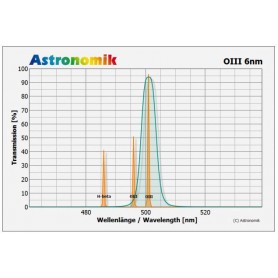 Filter OIII-CCD merupakan pilihan yang sangat baik untuk pencitraan nebula OIII, baik dari daerah perkotaan yang tercemar cahaya maupun lokasi langit gelap. Filter ini secara signifikan meningkatkan kontras antara objek yang memancarkan cahaya pada 501nm dan latar belakang, sehingga struktur yang samar tampak jelas. Dengan lebar pita sempit 6nm dan tingkat transmisi tinggi 96%, filter ini memblokir semua cahaya yang tidak diinginkan dari UV ke IR, sehingga menghasilkan latar belakang yang sangat gelap. Hal ini membuatnya ideal untuk pencitraan objek samar di bidang bintang yang padat atau di bawah polusi cahaya yang tinggi.