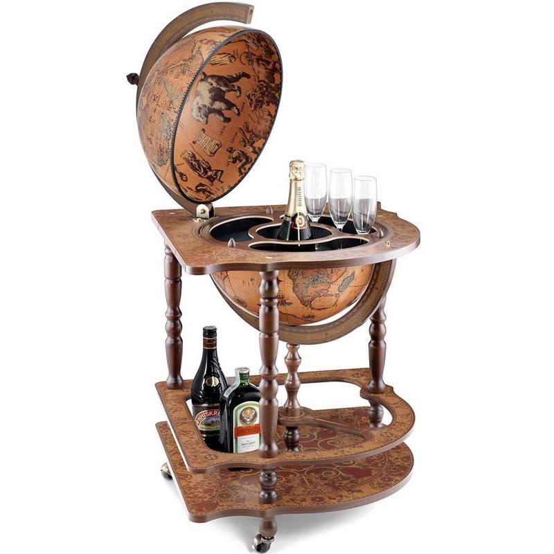 Hnatturinn fylgir stórkostlegri kortagerð sinni og býður upp á glæsilega valhnetufætur. Hægt er að geyma fleiri flöskur á neðri hillunni, skreyttar náttúrulegri vatnsmiðaðri málningu. Með hjólum er hægt að hreyfa hnöttinn áreynslulaust.
