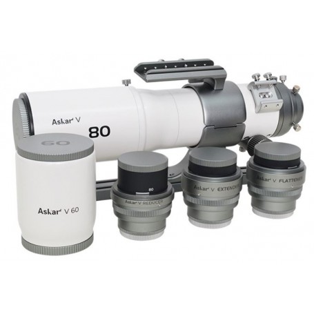 Este tubo óptico conecta-se facilmente a lentes de aberturas de 60 mm e 80 mm. Acompanhado de um flattenador, redutor e extensor dedicados, oferece uma faixa de distância focal flexível de 270 mm a 600 mm. O Askar V possui um sistema óptico refrator apocromático de três elementos com espaçamento de ar, incorporando duas lentes de baixa dispersão para uma correção superior da aberração cromática.