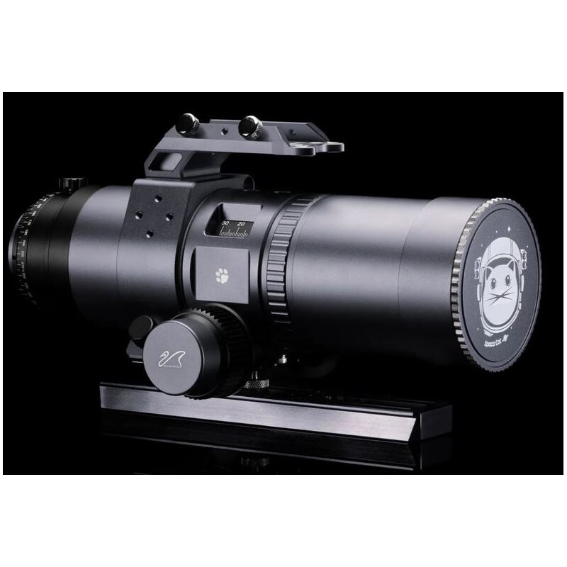 O trilho de prisma de 110 mm oferece três opções de montagem: uma rosca fotográfica padrão de 1/4", compatibilidade Arca-Swiss e compatibilidade estilo Vixen. Isto garante uma fixação fácil a tripés fotográficos comuns, suportes de câmara ou suportes astronómicos. O telescópio é fornecido com uma bolsa de transporte protetora em nylon e uma máscara de focagem Bahtinov especialmente desenhada, que está permanentemente integrada na tampa da lente para uma focagem precisa.