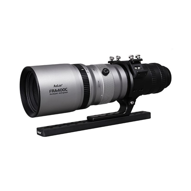 ASKAR FRA400 este un refractor apocromatic compact de tip Petzval, cu o distanță focală de 400 mm, o deschidere f/5.6 și o apertură de 72 mm. Designul optic cu cinci elemente include două elemente din sticlă ED, asigurând o corecție excelentă a aberației cromatice. Sistemul optic este complet corectat pentru camerele foto până la format full-frame, fiind astfel foarte potrivit pentru astrofotografie de înaltă calitate. Parasolarul extensibil oferă protecție eficientă împotriva luminii parazite și a condensului. Un focalizator robust, supradimensionat, suportă chiar și configurații de camere grele și permite focalizarea precisă datorită mecanismului său de reducere fină.